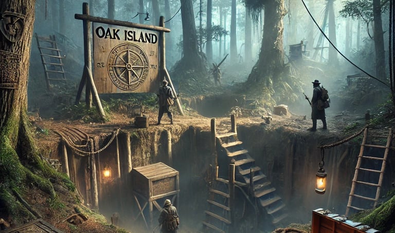 A história começa em 1795, quando um jovem chamado Daniel McGinnis encontrou uma depressão incomum no solo de Oak Island. Ele e dois amigos começaram a cavar e logo descobriram algo estranho: uma plataforma de toras de madeira a cerca de três metros de profundidade. Continuando a escavação, encontraram mais plataformas similares a cada três metros, sugerindo um tipo de poço construído deliberadamente.